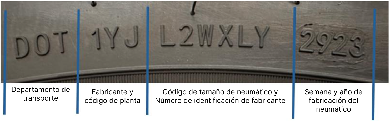 La fecha de fabricación del neumático la indican los últimos 4 dígitos del número de serie DOTimpreso en el panel lateral del neumático, que identifican la semana en que se fabricó el neumático en un año en particular. Un número DOT que termine en 2923 indica la semana 29 de 2023.